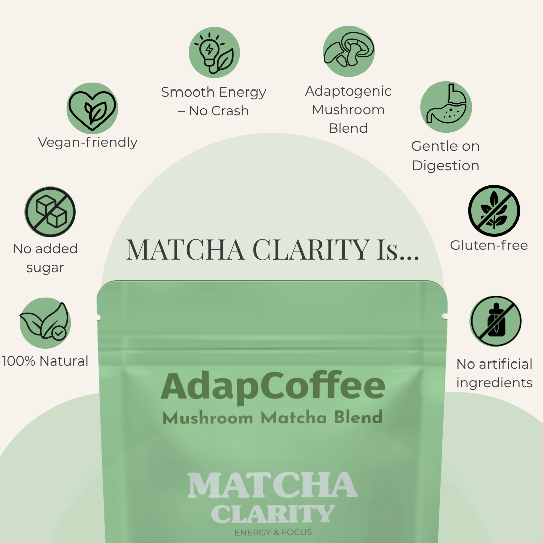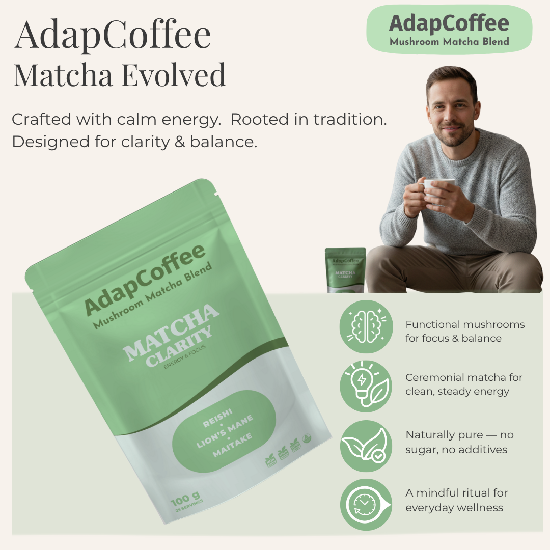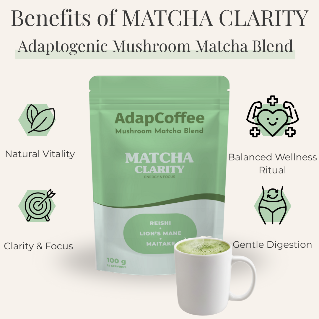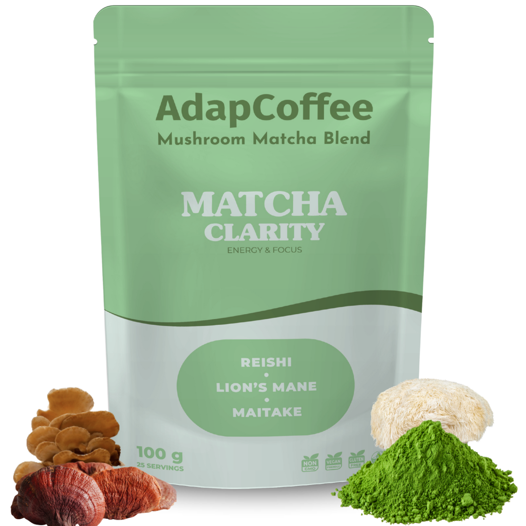Grâce à son matcha cérémonial et à ses extraits de champignons adaptogènes, Matcha Clarity de AdapCoffee :