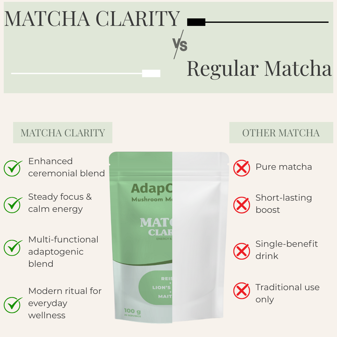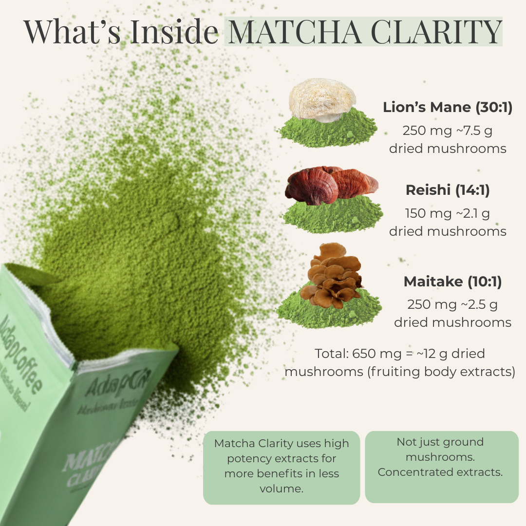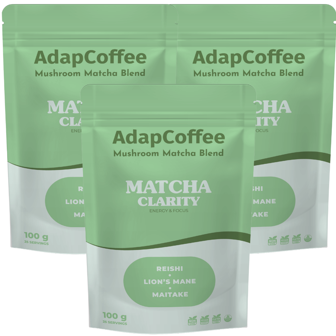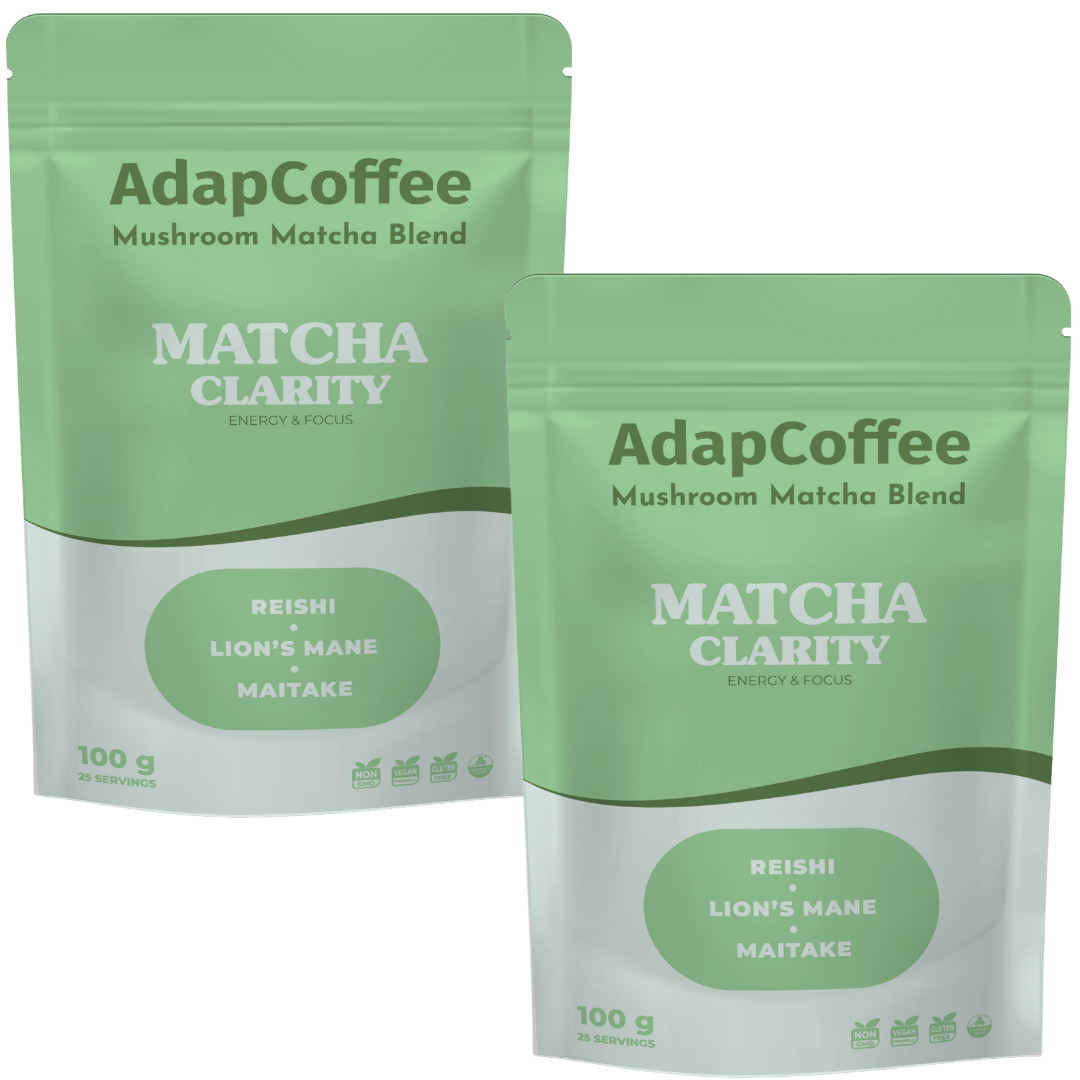 Grâce à son matcha cérémonial et à ses extraits de champignons adaptogènes, Matcha Clarity de AdapCoffee :