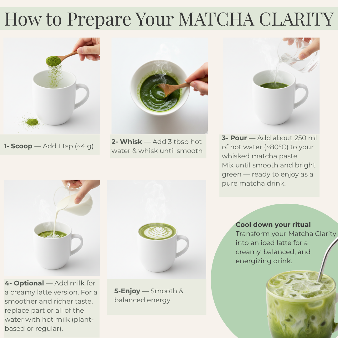 Ajoutez 1 cuillère bien remplie (~4 g) dans votre tasse. Versez 250 à 300 ml d’eau chaude ou froide – c’est aussi délicieux en version glacée. Mélangez simplement à la cuillère ou utilisez un mousseur à lait pour une texture encore plus onctueuse. Savourez tel quel, ou ajoutez un lait (végétal ou non) et une touche de miel, sirop d’agave ou stevia. Une tasse par jour suffit pour faire de Clarity Cup votre rituel bien-être préféré.